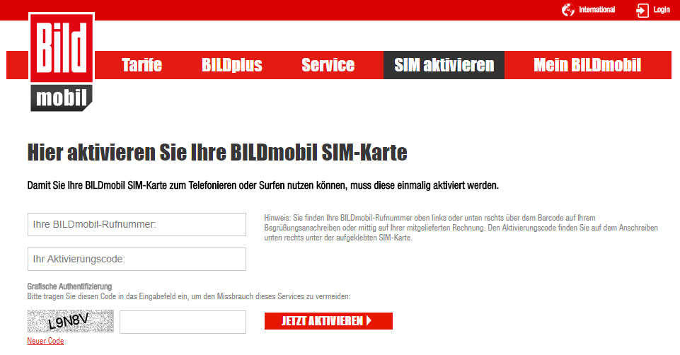 Zur Aktivierung Deiner BILDmobil SIM-Karte benötigst Du Deine Mobilfunknummer und den Aktivierungscode. Alle Daten werden Dir nach der Bestellung zusammen mit der SIM-Karte zugesandt. Auf der Webseite von BILDmobil findest Du oben im Menü den Reiter „SIM aktivieren“. Hier gibst Du einfach Deine Rufnummer, den Aktivierungscode und das Captcha ein. Nun klickst Du auf „jetzt aktivieren“. Nach etwa 1-2 Stunden kannst Du Deine SIM-Karte nutzen.
